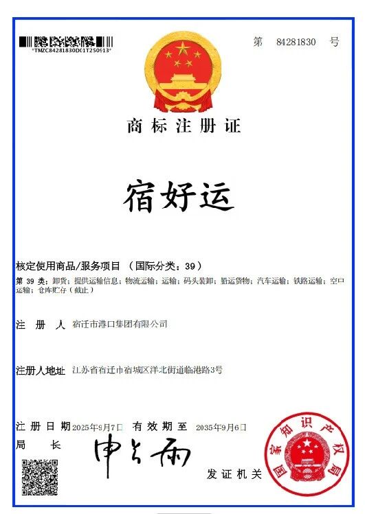 宿迁港口集团:“宿好运”商标成功注册